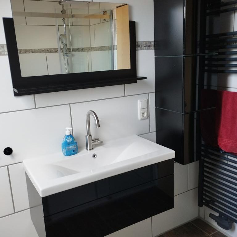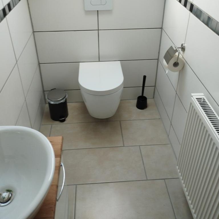 Das moderne Duschbad lädt mit einer geräumigen Dusche, WC und Waschbecken zu entspannenden Morgen- und Abendritualen ein. Helle Fliesen und ausreichend Platz sorgen für Komfort und Frische – perfekt für Familien.