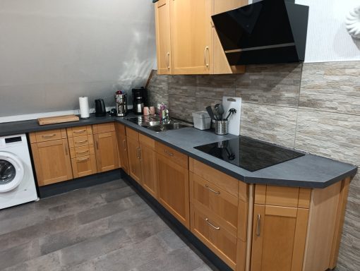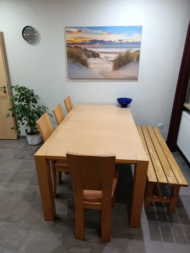 Die Küche ist voll ausgestattet mit Kühl-Gefrierkombination, Spülmaschine und Induktionskochfeld. Für mindestens 6 Personen steht ausreichend Besteck, Geschirr und Utensilien zur Verfügung. Ein großer Esstisch lädt nicht nur zum gemeinsamen Mahl, sondern eignet sich auch ideal für Spieleabende, und eine Waschmaschine sorgt für zusätzlichen Komfort.